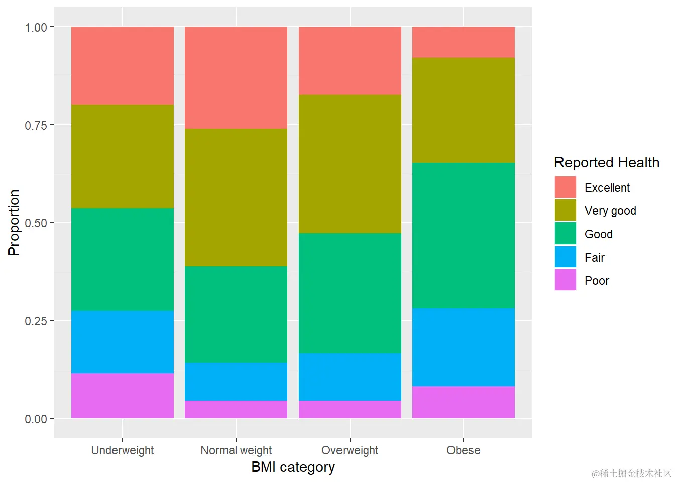 每列代表4种BMI类别(体重过轻,正常,超重,肥胖)和描述自己健康状况的受访者比例。