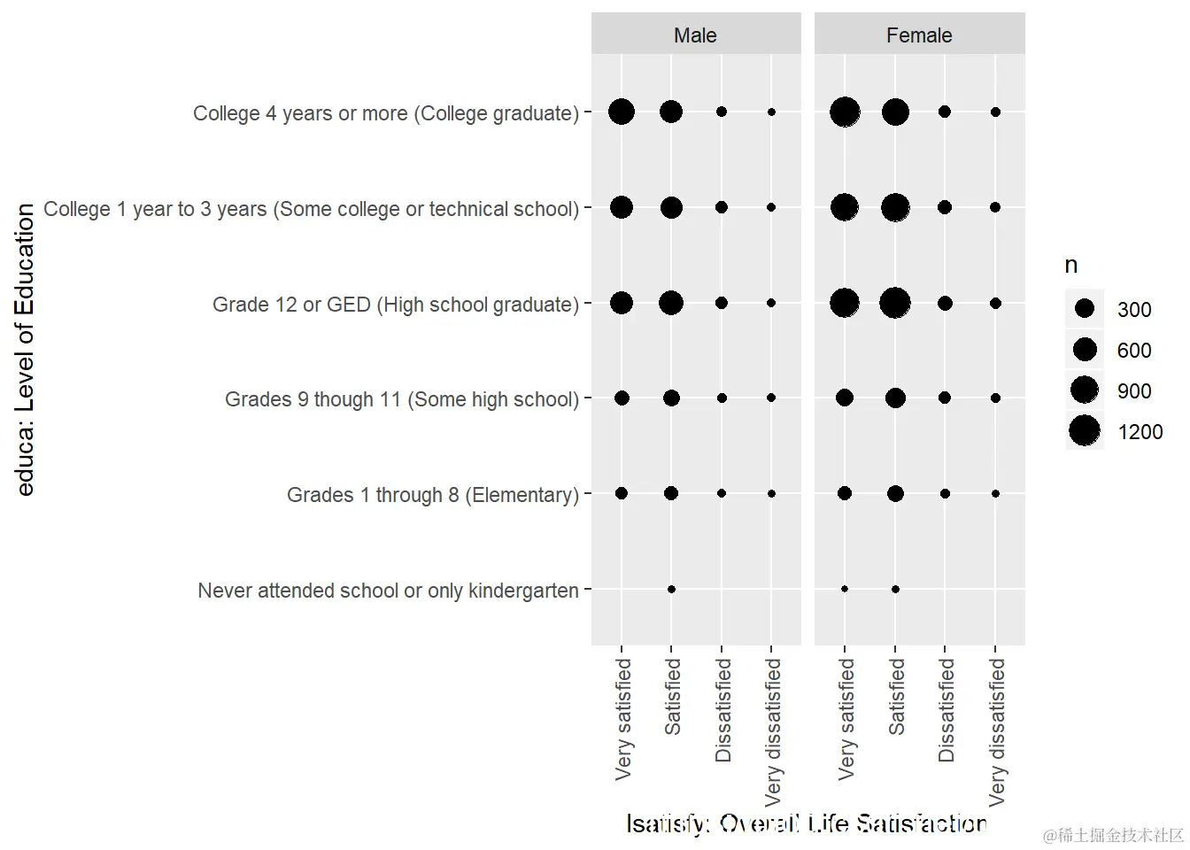 男性和女性的教育水平和总体生活满意度之间似乎总体上呈正相关。至少完成了高中(或同等学历)的人的满意度似乎更高。数据中还存在某些异常值,其中一些反馈者在没有受过教育的情况下会“满意”或“非常满意”。由于大多数人口至少已从高中毕业,因此该数据似乎准确地代表了受访者的分布。