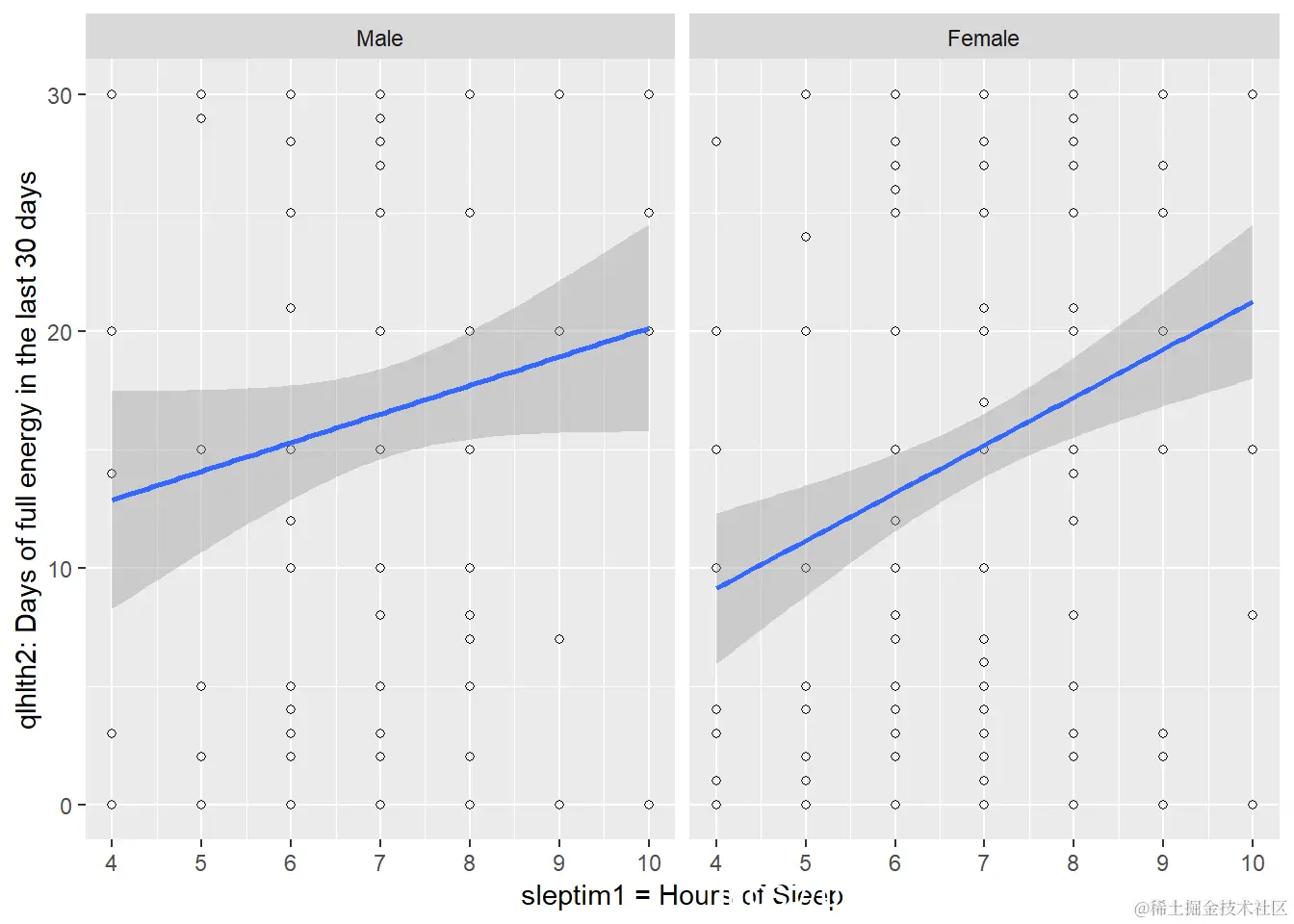 睡眠时间和充满能量的天数之间似乎总体上呈正相关。女性的相关性似乎比男性略强,因为男性的数据分布更广泛。