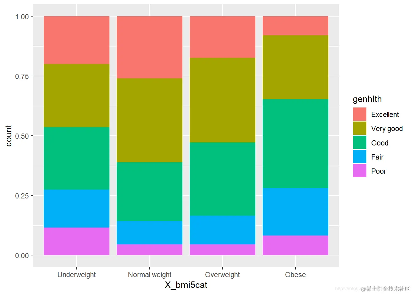 g1 <- ggplot(q1) + aes(x=X_bmi5cat,fill=genhlth) + geom_bar(position = "fill")