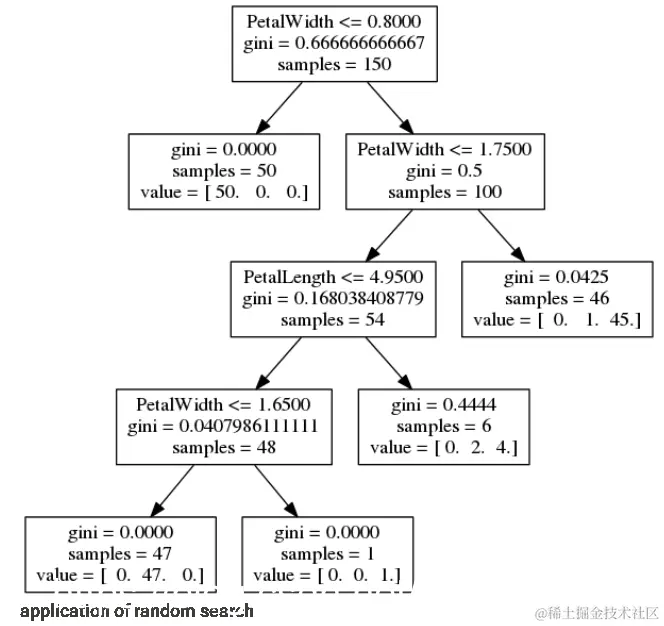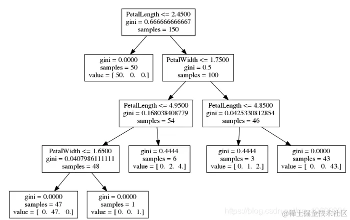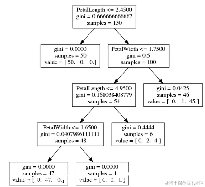- 在顶部,我们看到最有用的条件是 PetalLength <= 2.4500。