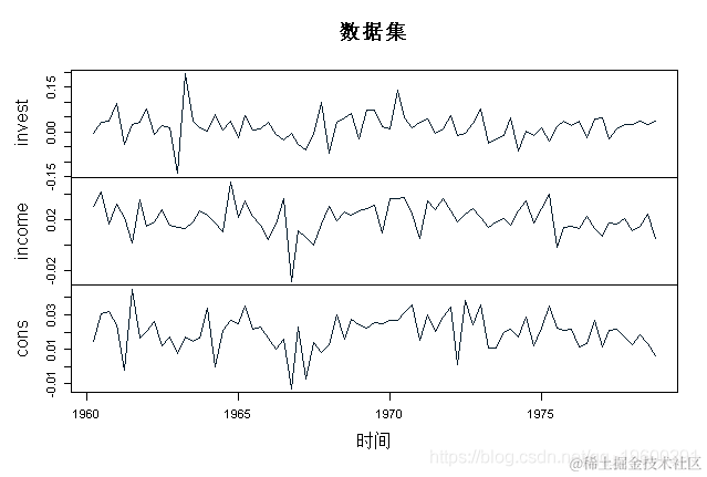 为了说明脉冲响应函数的概念,使用了Lütkepohl(2007)的示例。可以从教科书的网站上下载所需的数据集。它包含从1960年1季度到1982年4季度按季度和季节性调整的时间序列,这些序列是西德的固定投资,可支配收入和数十亿德国马克的消费支出。