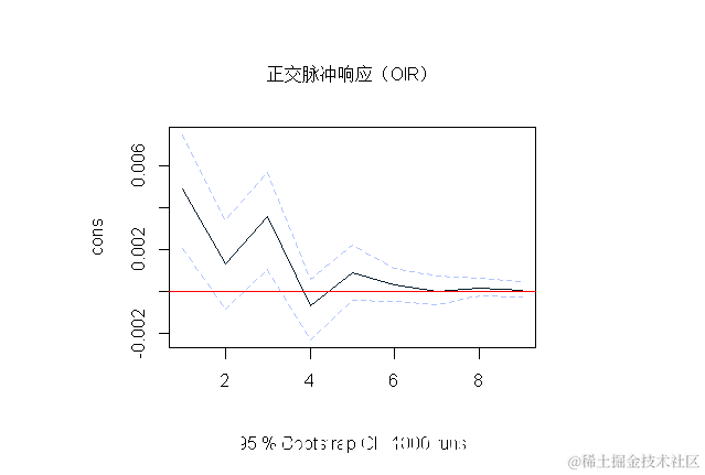 请注意,Choleski分解的输出是一个较低的三角矩阵,因此第一行中的变量永远不会对任何其他变量的同时冲击敏感,而系统中的最后一个变量将对所有其他变量的冲击敏感。因此,OIR的结果可能对变量的顺序很敏感,建议用不同的顺序估计上述VAR模型,以查看所产生的OIR受此影响的程度。