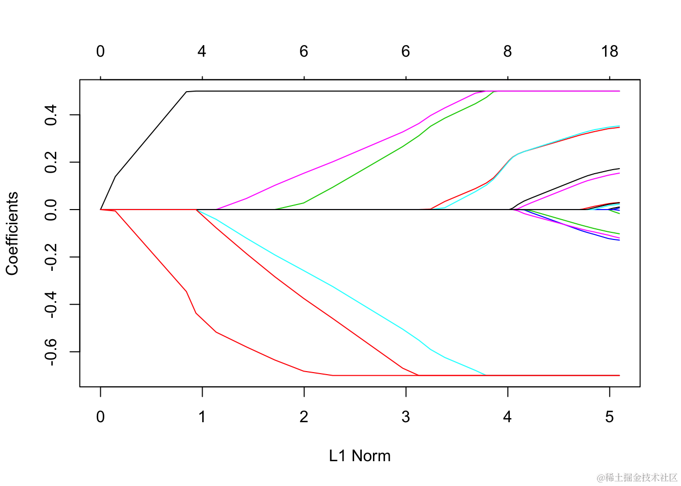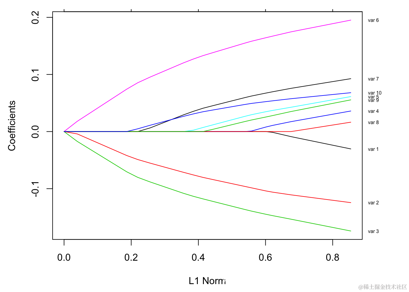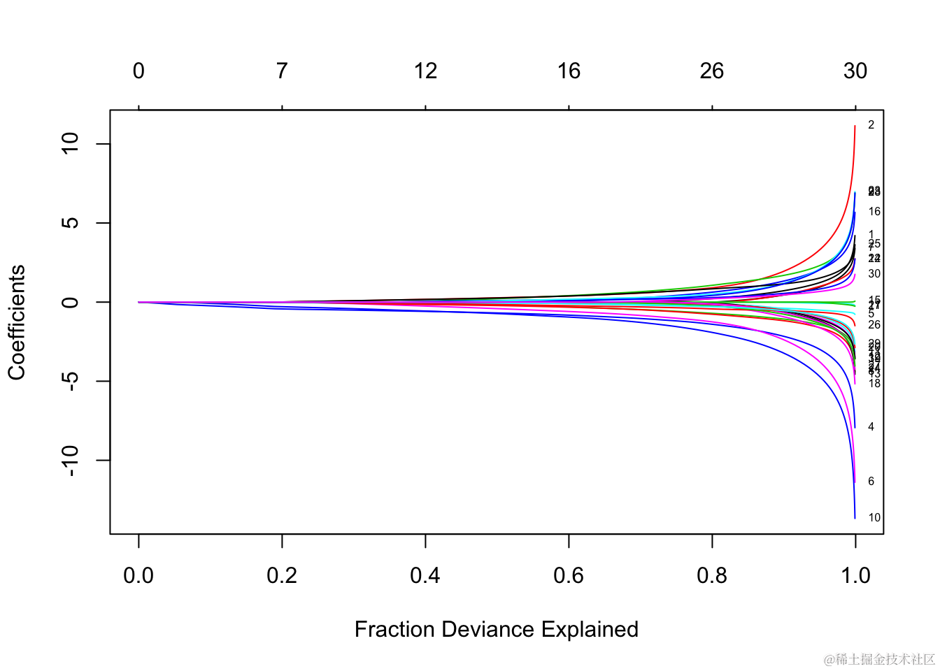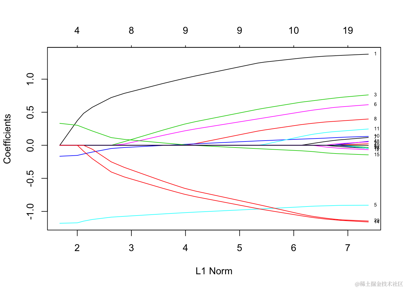 每条曲线对应一个变量。它显示了当λ变化时,其系数相对于整个系数向量的ℓ1范数的路径。上方的轴表示当前λ处非零系数的数量,这是套索的有效自由度(df)。用户可能还希望对曲线进行注释。这可以通过label = TRUE 在plot命令中进行设置来完成 。