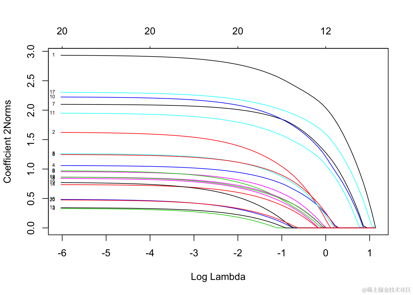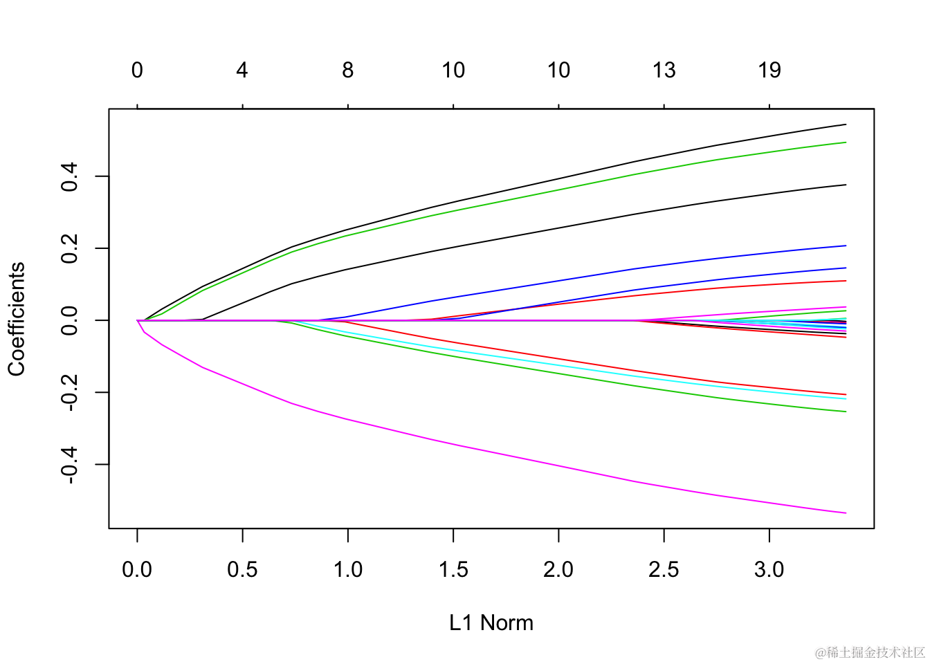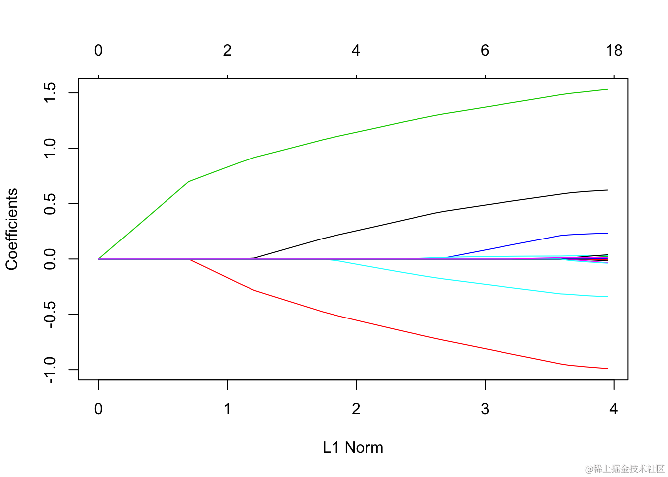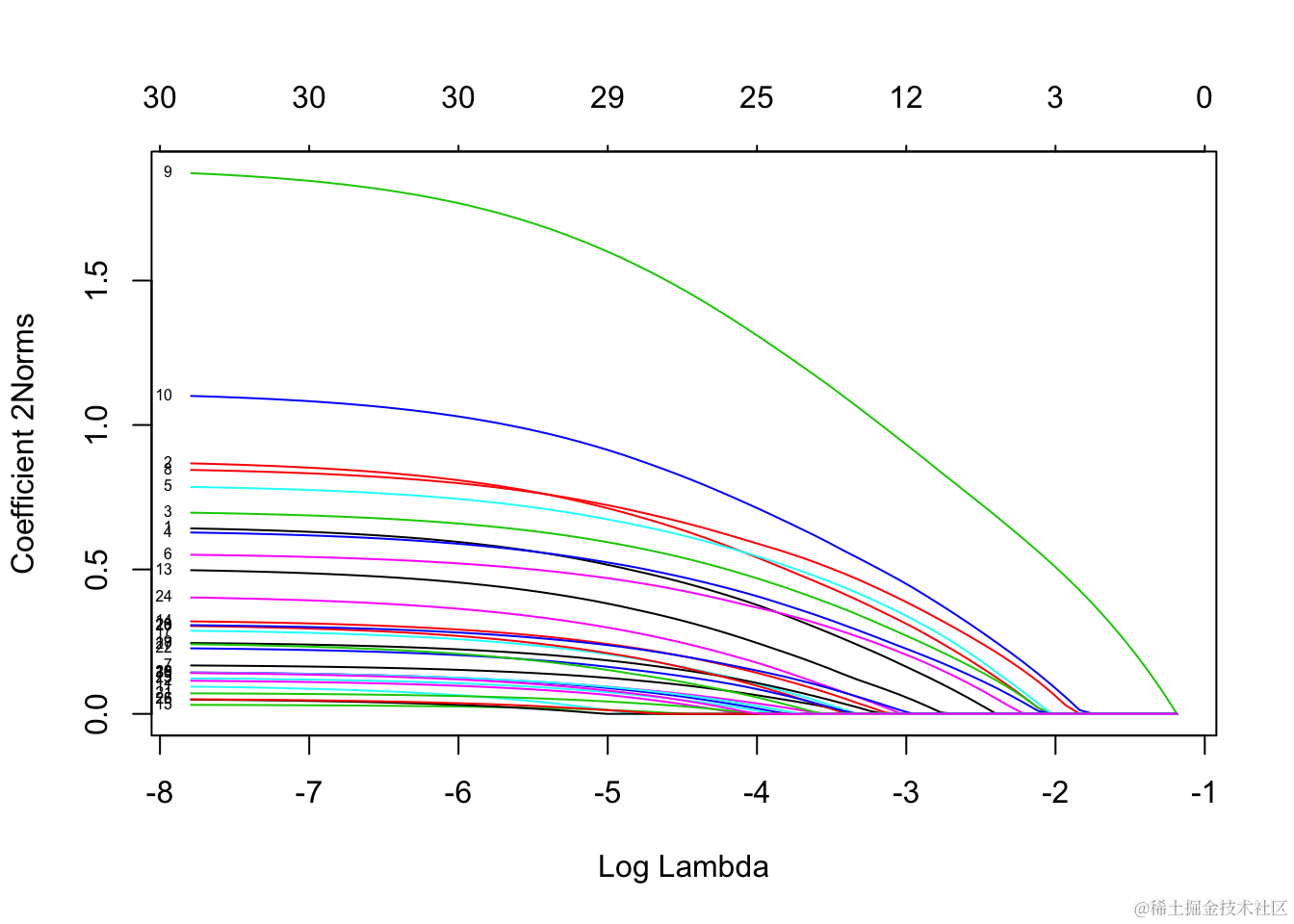 每条曲线对应一个变量。它显示了当λ变化时,其系数相对于整个系数向量的ℓ1范数的路径。上方的轴表示当前λ处非零系数的数量,这是套索的有效自由度(df)。用户可能还希望对曲线进行注释。这可以通过label = TRUE 在plot命令中进行设置来完成 。