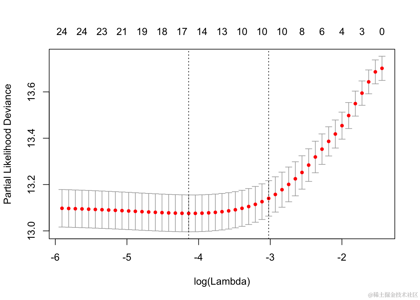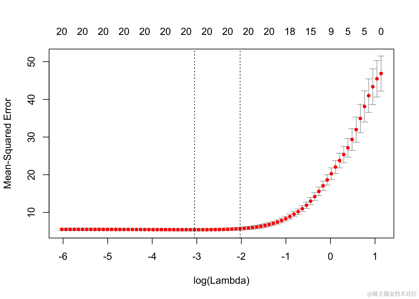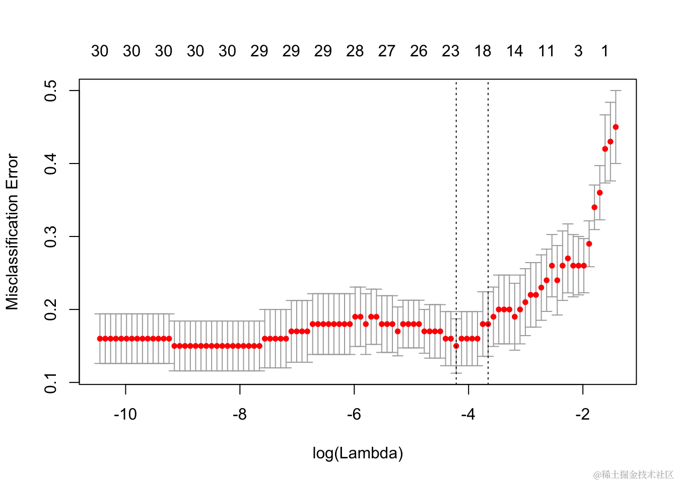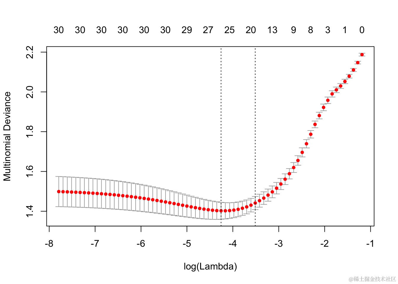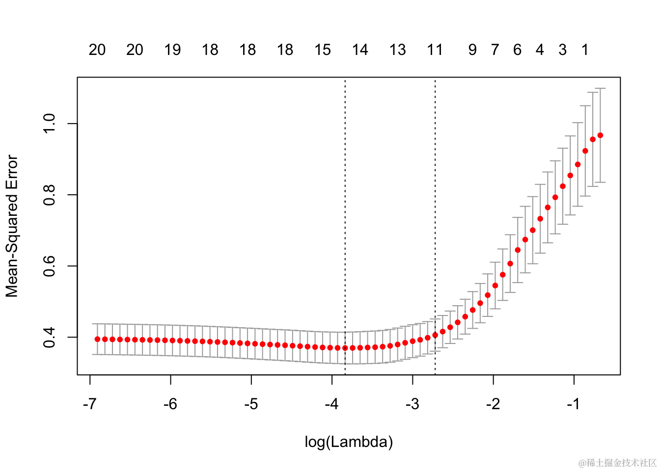 它包括交叉验证曲线(红色虚线)和沿λ序列的上下标准偏差曲线(误差线)。垂直虚线表示两个选定的λ。