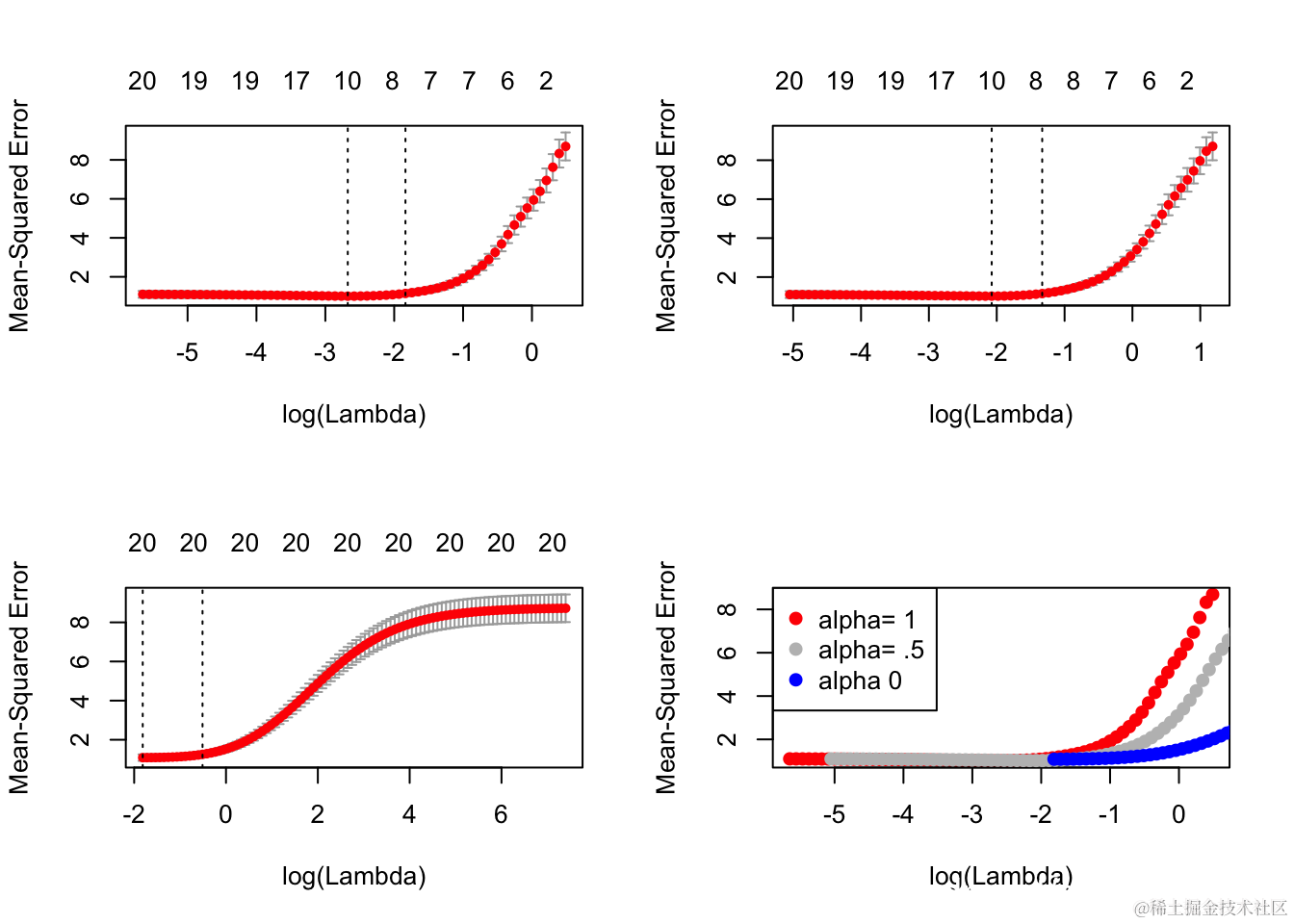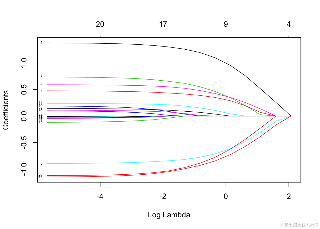 该函数 glmnet 返回一系列模型供用户选择。交叉验证可能是该任务最简单,使用最广泛的方法。