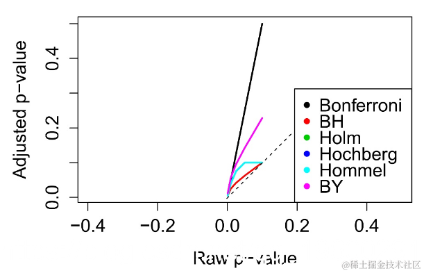 0至0.1之间的五个p值系列的调整p值与原始p值的关系图。请注意,Holm和Hochberg与Hommel具有相同的值,因此被Hommel隐藏。虚线表示一对一的线。
