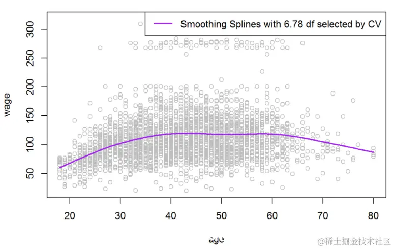 ## smooth.spline(x = age, y = wage, cv = TRUE)