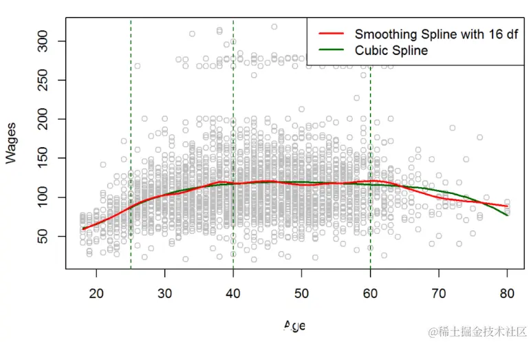现在我们可以注意到,红线(即“光滑样条线”)更加波动,并且更灵活地拟合数据。这可能是由于高度的自由度所致。选择参数 λ 和DF最好的办法 是交叉验证。