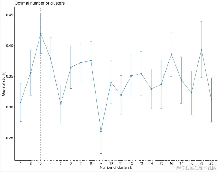 如上图所示,Gap统计量的最大值是k = 3。因此,数据集中理想的聚类数目为3。