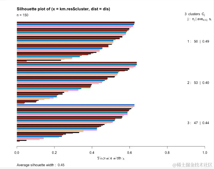 前面的图给出了数据集的平均轮廓分数为0.45。它还显示了聚类和点聚类的平均轮廓分数。