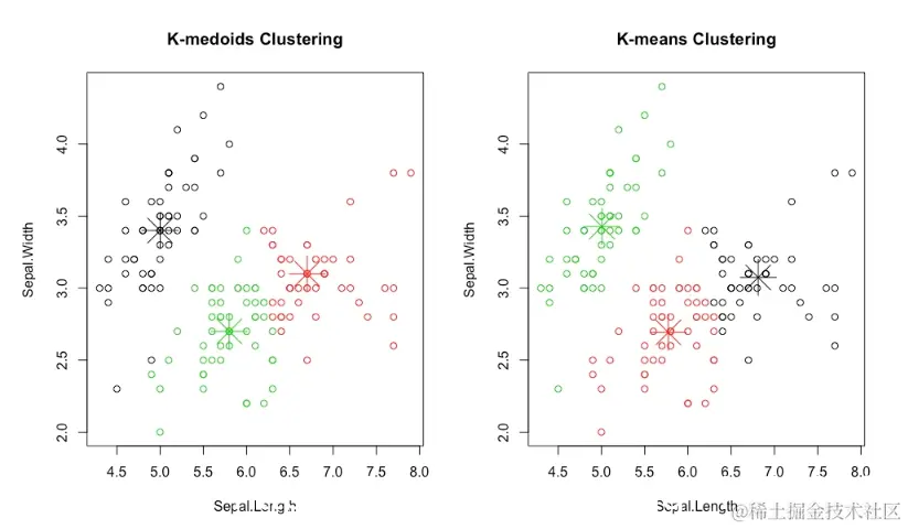 图:k-medoids聚类与k-means聚类的结果
