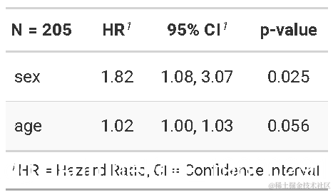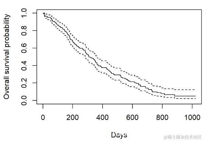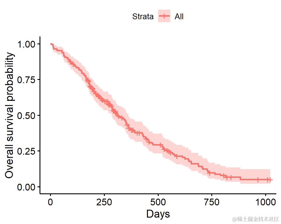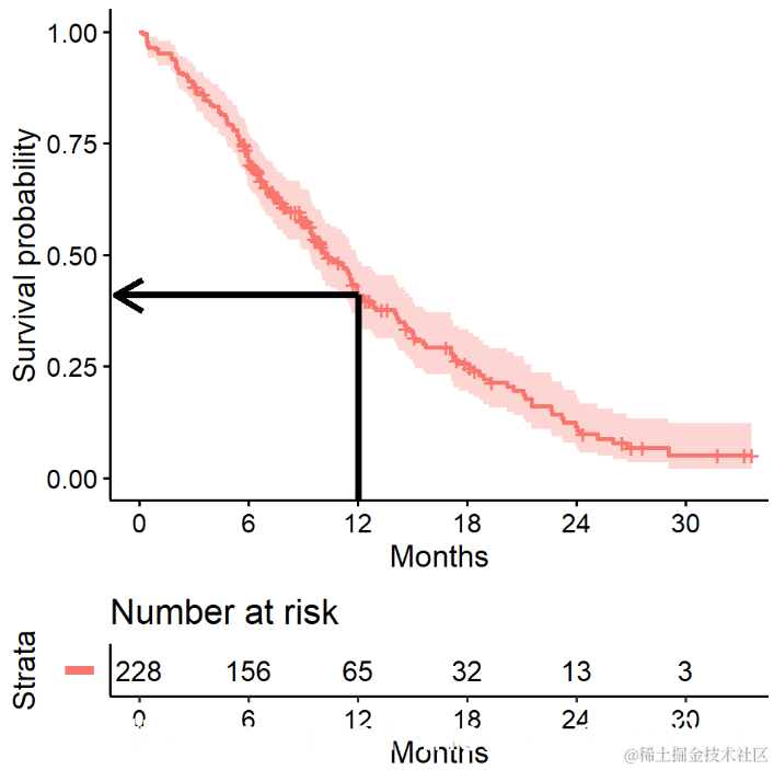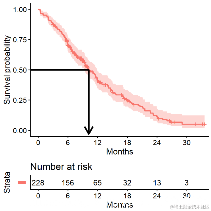 有时可能想根据连续变量来可视化生存估计。 求 生存数据的分位数。默认分位数是p = 0.5中位生存期。