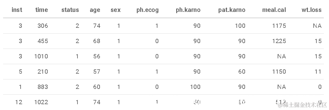 数据包含来自北中部癌症治疗组的晚期肺癌患者。今天我们将用来演示方法的一些变量包括