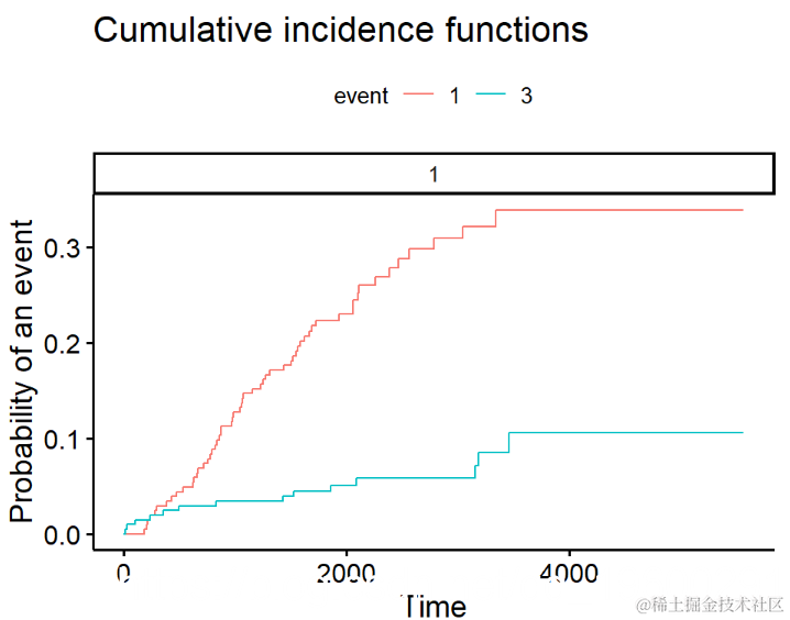 通常,只有一种类型的事件会引起人们的兴趣,尽管我们仍要考虑竞争事件。在那种情况下,感兴趣的事件可以单独绘制。同样,我首先通过创建cuminc拟合结果的整洁数据集,然后绘制结果来手动执行此操作。有关底层代码的详细信息,请参见此演示文稿的源代码。