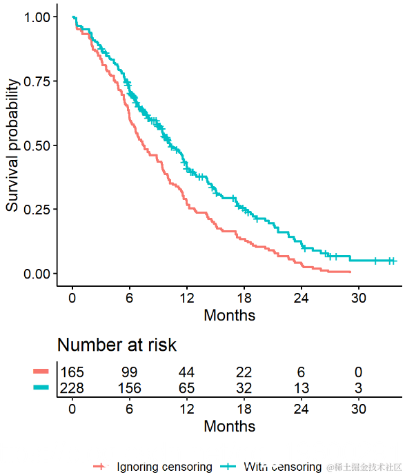 所得出的曲线在我们每次进行条件调整时都有一条生存曲线。在这种情况下,第一条线是总体生存曲线,因为它是根据时间0进行调节的。