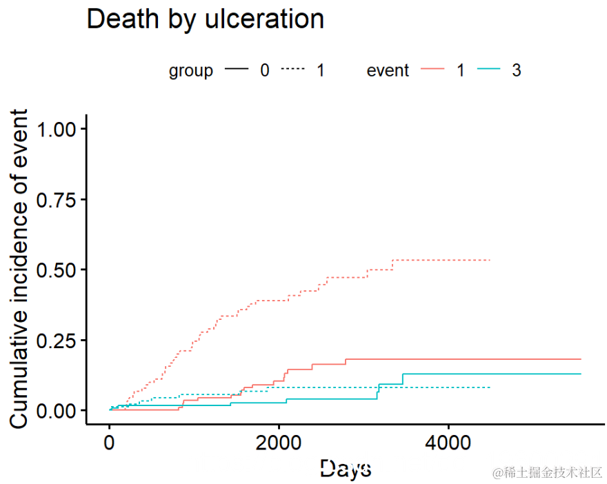 请注意, 我个人发现该ggcompetingrisks功能缺少自定义功能,尤其是与相比ggsurvplot。我通常会自己做图,首先创建cuminc拟合结果的整洁数据集,然后再绘制结果。有关底层代码的详细信息,请参见此演示文稿的