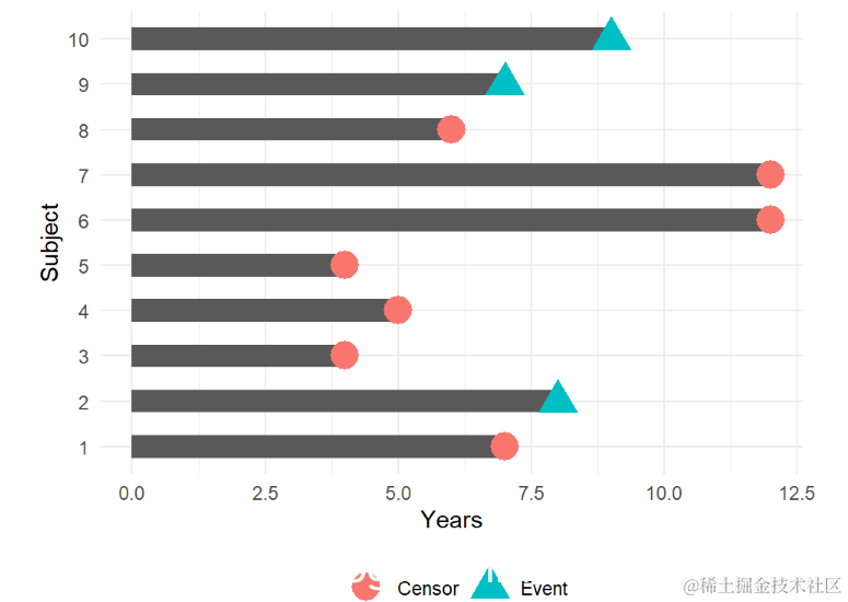 受试者2、3、5、6、8、9和10 在10年时都是无事件的。受试者4和7 在10年之前发生了该事件。主题1 在10年之前已被审查,因此我们不知道他们是否在10年之前有此事件-我们如何将该主题纳入我们的估计中?