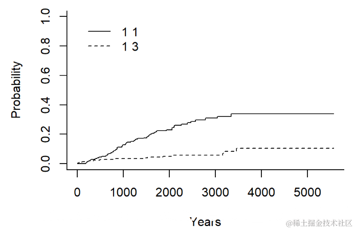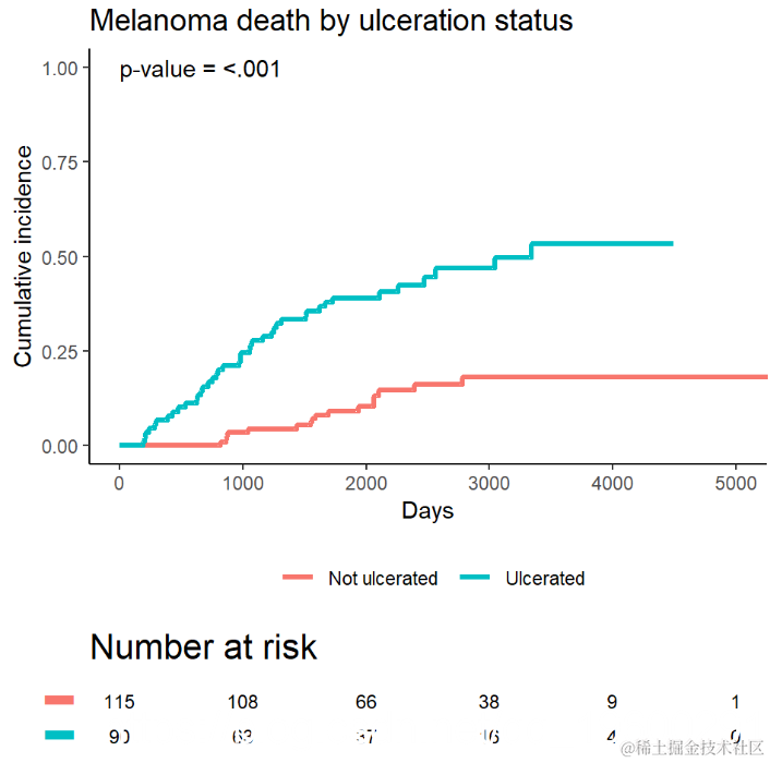 您可能想将风险表的数量添加到累积发生率图中,而据我所知,没有简单的方法可以做到这一点。请参阅此演示文稿的源代码中的一个示例