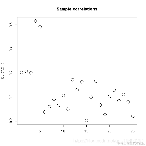 plot(cor(X,Y),xlab="j",ylab="Cor(Y,X_j)",main="Sample correlations",cex=2)