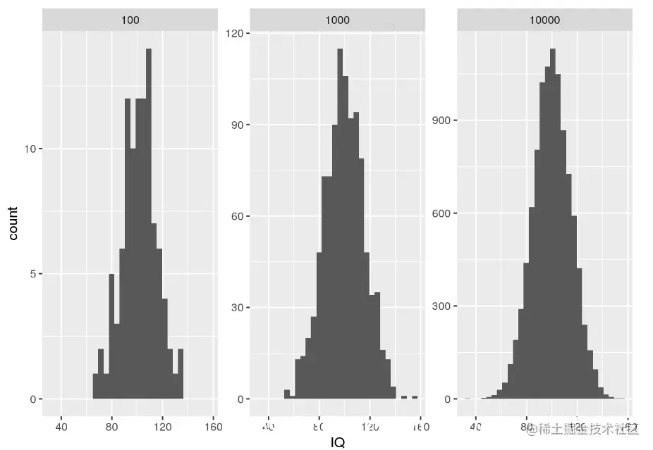 当您想从正态分布中抽取随机样本时,可以使用rnorm。例如,我们可以rnorm用来模拟IQ分布中的随机样本。