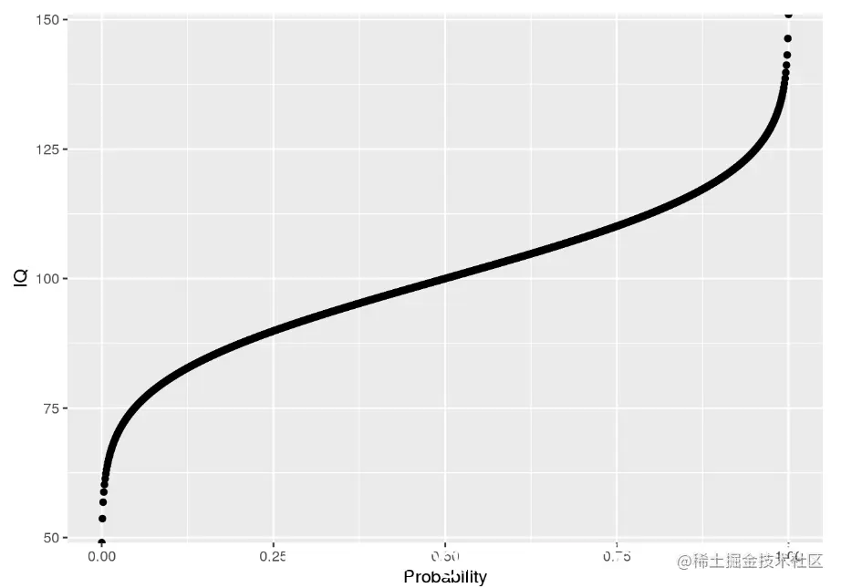 ggplot(icdf.df, aes(x = Probability, y = IQ)) + geom_point()