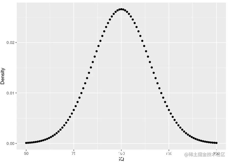 使用密度,可以确定事件的概率。例如,您可能想知道:一个人的IQ恰好为140的可能性是多少? 。在这种情况下,您将需要检索IQ分布在值140处的密度。可以用100的平均值和15的标准差对IQ分布进行建模。相应的密度为: