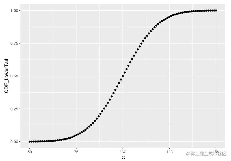 ggplot(iq.df, aes(x = IQ, y = CDF_LowerTail)) + geom_point()