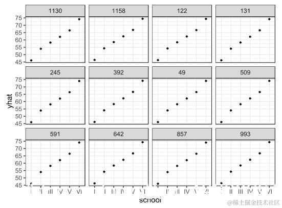 如何解释我们的随机效应的实质性影响?在使用多层次结构的观察工作中,这往往是至关重要的,了解分组对个体观察的影响。为了做到这一点,我们选择了12个随机案例,然后模拟他们的预测值,如果他们被安排在6所学校中的每一所,他们的extro预测值。请注意,这是一个非常简单的模拟,只是使用了固定效应的平均值和随机效应的条件模式,并没有进行复制或抽样。