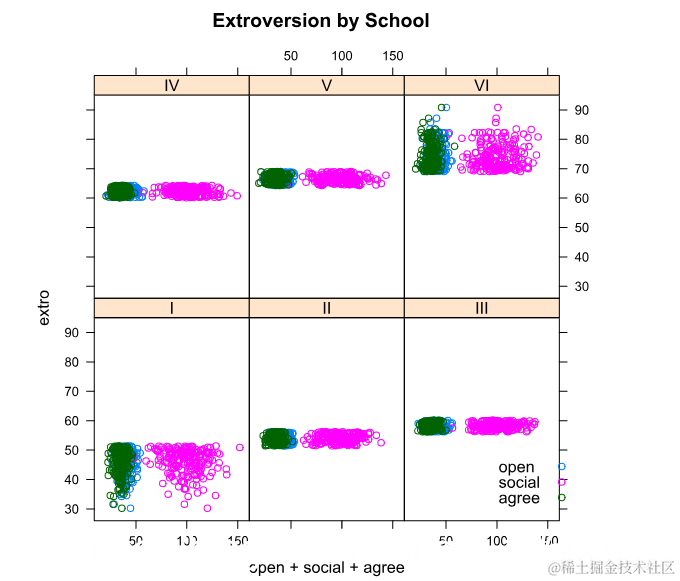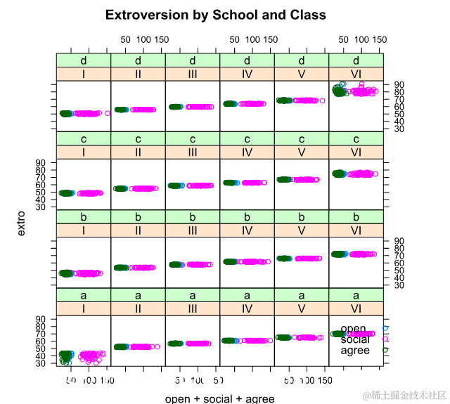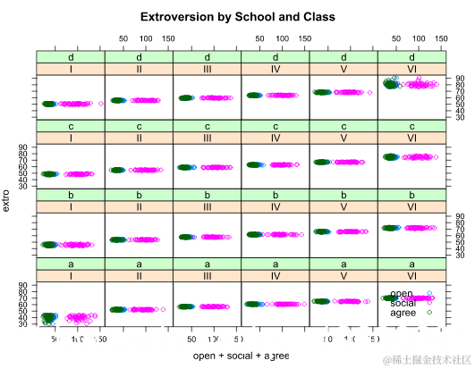 这里我们可以看到,学校和班级似乎密切区分了我们的预测因素和外向性之间的关系。