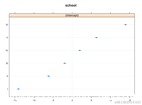 这个图形显示了随机效应项的点阵图,也被称为毛毛虫图。在这里,你可以清楚地看到每个学校对外向性的影响,以及它们的标准误差,以帮助确定随机效应之间的区别。