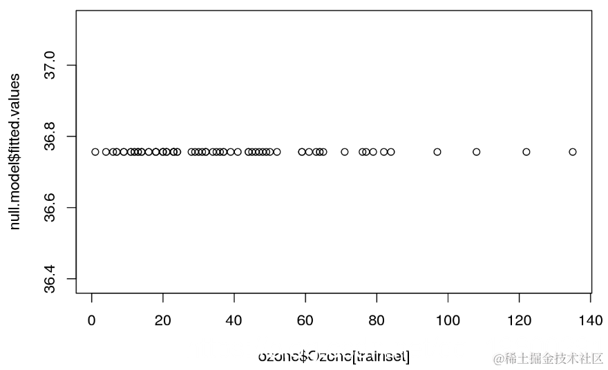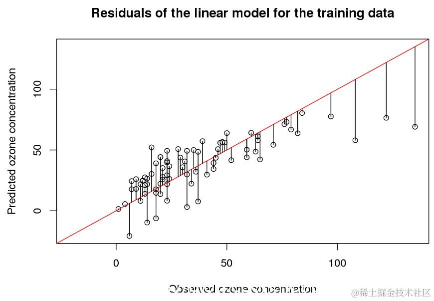 残差值表明,该模型通常预测的臭氧值略高于观测值。但是,最大值很大,表明某些离群值预测太低了。查看数字可能有点抽象,因此让我们根据观察值绘制模型的预测: