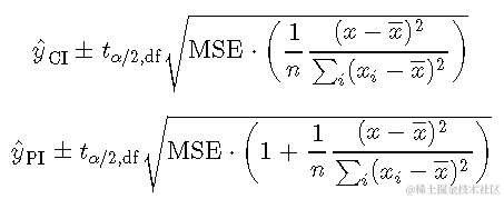 其中tα/ 2,dftα/ 2,df是df = 2自由度且显着性水平为α的t值,σerr是残差的标准误差,σ2xσx2是独立特征的方差, x(x)表示特征的平均值。