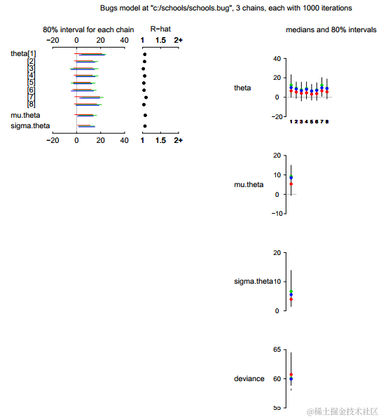 推论和收敛(所有参数的Rb都接近1.0,表明三个链的良好混合,因此近似收敛);右列显示每组参数的推论。从右栏中可以看到,R2WinBUGS使用 WinBUGS中的参数名称将输出构造为标量,向量和参数数组。