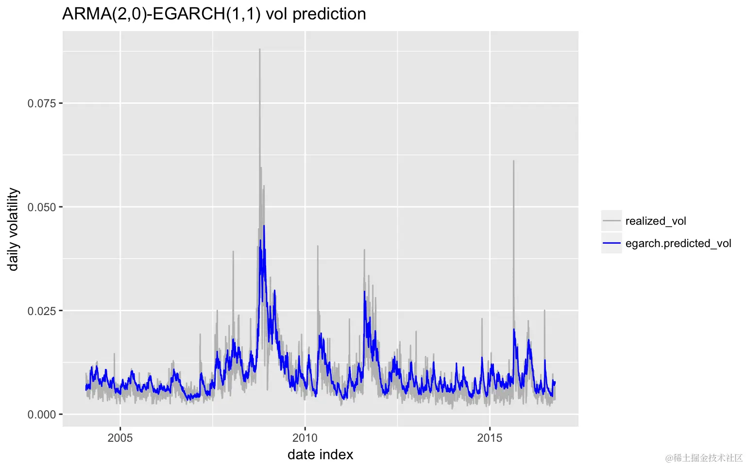 我用4189个观测值进行了回测(从2000-01-03到2016-10-06),使用前1000个观测值训练模型,然后每次向前滚动预测一个,然后每5个观测值重新估计模型一次 。下图显示 了样本外 预测和相应的实际波动率。
