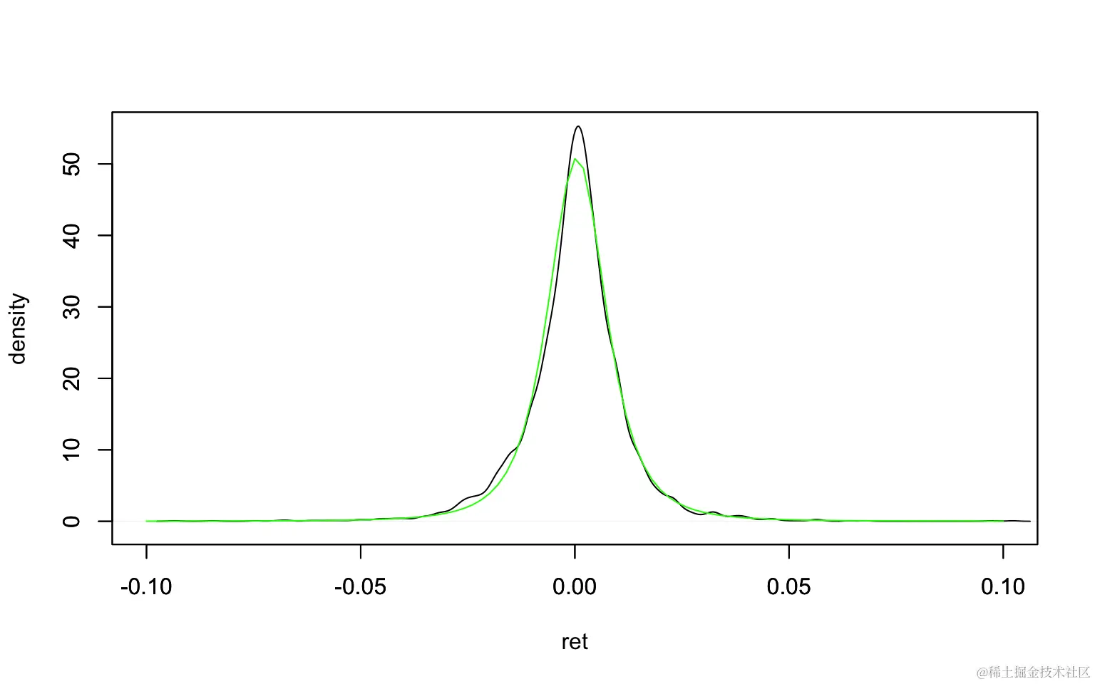 分布显示出尖峰和厚尾。可以通过t分布回归分布密度图来近似 。黑线是内核平滑的密度,绿线是t分布密度。