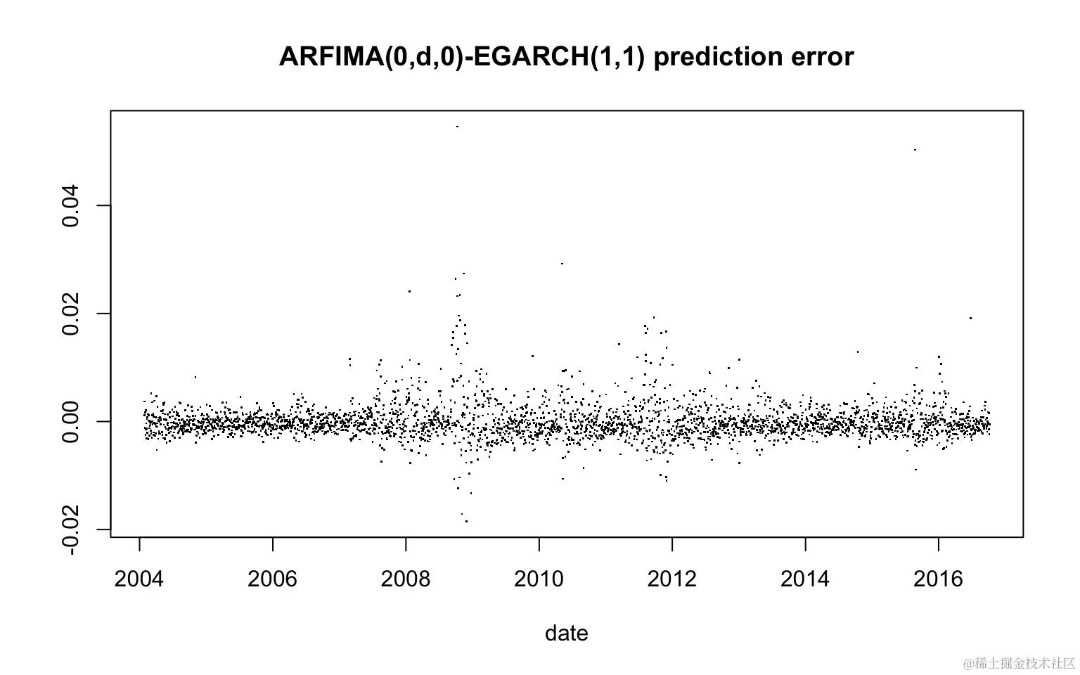 auro.arima 表示ARIMA(2,0,0)可以对收益序列中的自相关进行建模,而eGARCH(1,1)在波动率建模中很受欢迎。因此,我选择具有t分布的ARMA(2,0)-eGARCH(1,1)作为基准模型。
