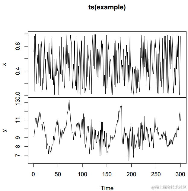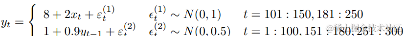 示例数据是一个模拟数据集,用于展示如何检测两种不同模式的存在:一种模式中的响应变量高度相关,另一种模式中的响应仅取决于外生变量x。自相关观测值的区间为1到100、151到180 和251到300。每种方案的真实模型为: