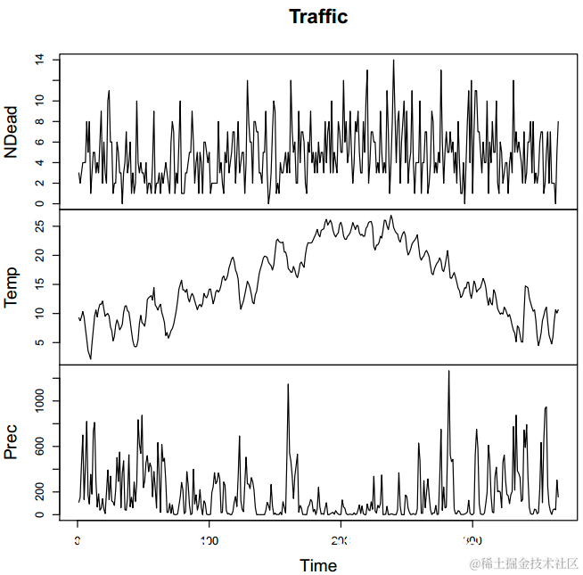 交通数据包含2010年西班牙交通事故的每日人数,平均每日温度和每日降水量。该数据的目的是研究死亡人数与气候条件之间的关系。由于在周末和工作日变量之间存在不同的行为,因此我们说明了在这种情况下使用广义马尔科夫转换模型的情况。