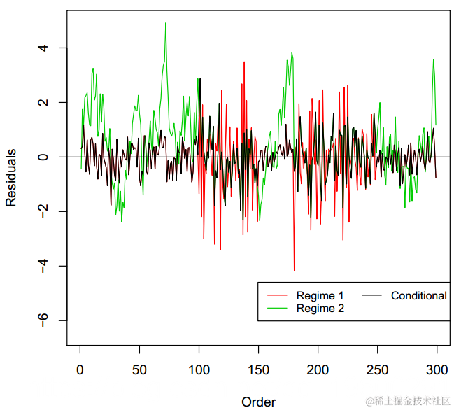 协变量确实很重要,但是模型解释的数据行为非常糟糕。图1中的线性模型残差图表明,它们的自相关很强。残差的诊断图(图2)确认它们似乎不是白噪声,并且具有自相关关系。接下来,将自回归马尔可夫转换模型(MSM-AR)拟合到数据。自回归部分设置为1。为了指示所有参数在两个周期中都可以不同,将转换参数(sw)设置为具有四个分量的矢量。拟合线性模型时的最后一个值称为残差。