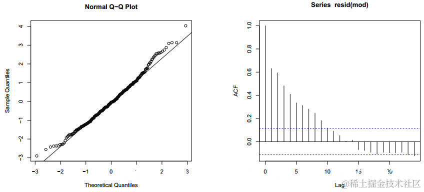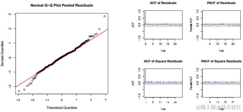 由于模型是通用线性模型的扩展,因此从类对象计算出图中的Pearson残差。该残差有白噪声的经典结构。残差不是自相关的,但它们与正态分布不太吻合。但是,Pearson残差的正态性不是广义线性模型验证的关键条件。
