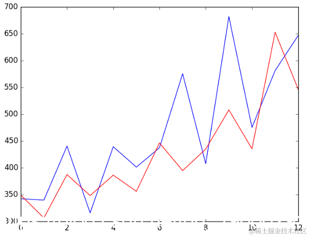 创建一个折线图,显示与滚动预测预测(红色)相比的期望值(蓝色)。我们可以看到这些值显示出一些趋势并且处于正确的范围内。