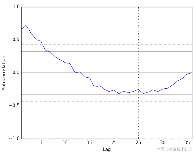 我们还快速浏览一下时间序列的自相关图。下面的示例绘制了时间序列中滞后的自相关。