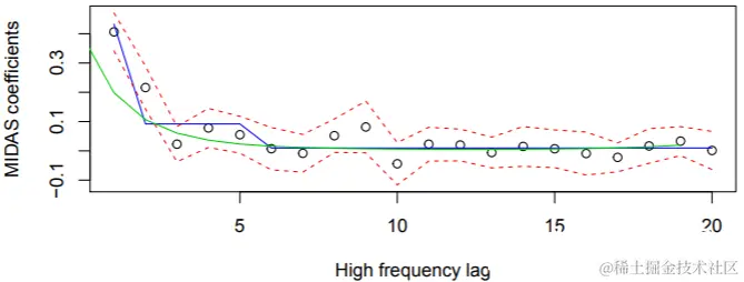 图说明了拟合的MIDAS回归系数和U-MIDAS回归系数及其相应的95%置信区间。对于指数Almon滞后指标,我们可以通过AIC或BIC选择滞后次数。