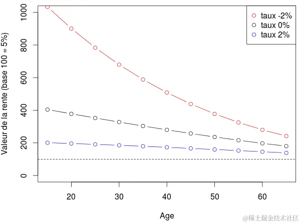 对于年轻人来说,情况甚至更糟。如果我们以不同的费率水平(5%,2%,0%和-2%)计算直到死亡的多个年龄的年金,我取负率