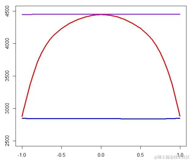 顶部的紫色线是的可变重要性值 ,该值相当稳定(作为一阶近似值,几乎恒定)。红线是的变量重要性函数,