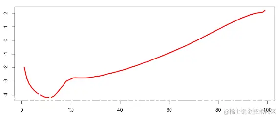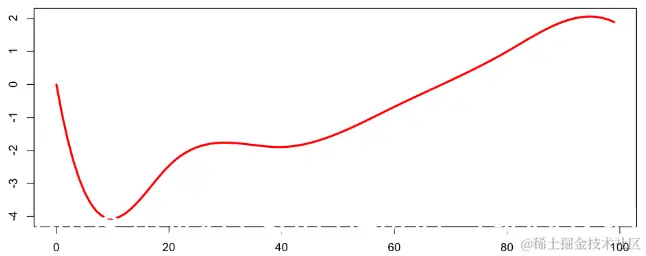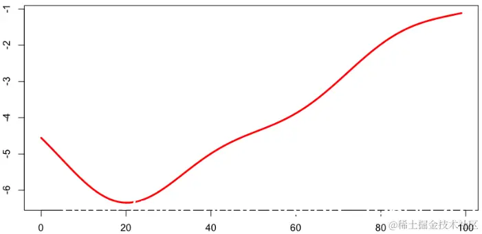 plot(seq(0,99),Vectorize(predAx)(seq(0,99)),col="red",lwd=3,type="l")