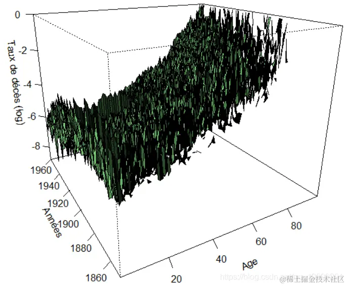 由于我们缺少一些数据,因此我们想使用一些广义非线性模型。因此,让我们看看如何获得死亡率曲面图的平滑估计。我们编写一些代码。
