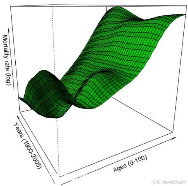 然后,我们可以使用样条函数的平滑参数,并查看对死亡率曲面的影响